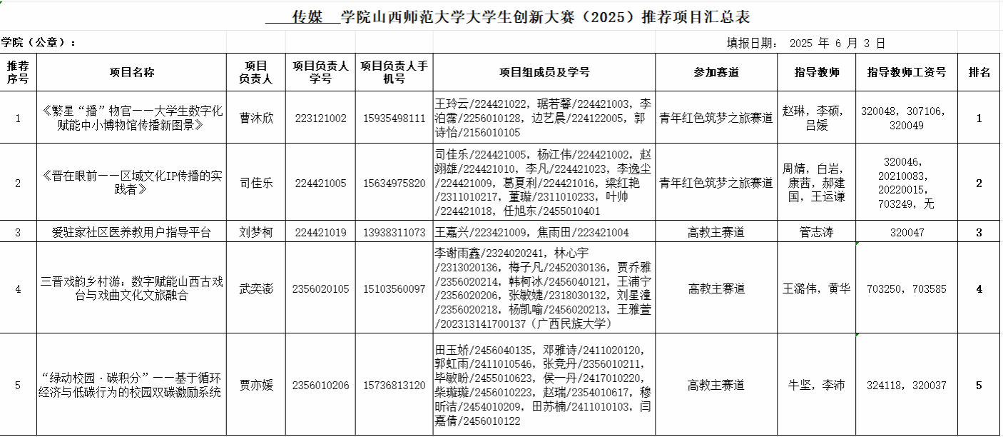 根据学校关于举办大学生创新大赛的相关通知要求,我院积极组织院级初赛申报及评审工作,经学生自主申报、学院教学督导委员会特邀校内创新创业领域资深教师组成评审专家组,依据学校分配的推荐名额,对各参赛项目进行综合评审。现将院级初赛结果公示如下,公示时间:2025年6月3日至6月4日。